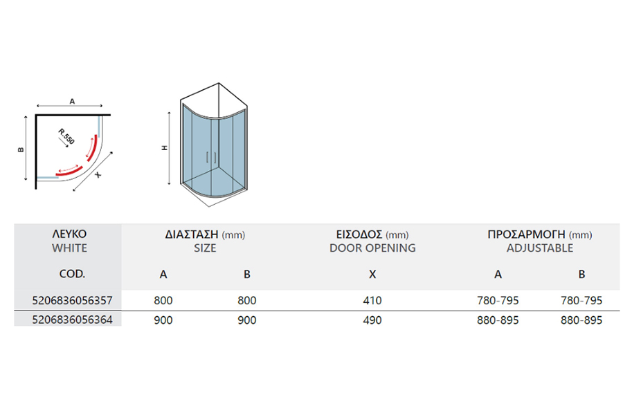Polkrožna tuš kabina Efe 200 White dimenzije 900x900x1900 mm.