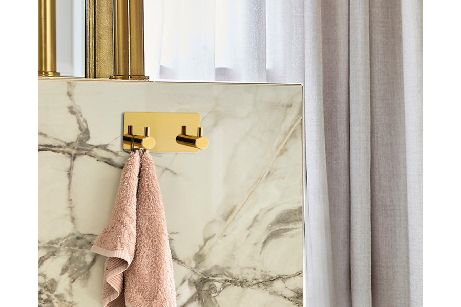 Dvojno obešalo za kopalnico v sijajno zlati barvi združuje sodoben dizajn in preprosto funkcionalnost. Izdelano je iz barvanega jekla, njegov eleganten videz pa se lepo poda različnim notranjim slogom. Namestitev s samolepilnim trakom je hitra in enostavna, brez potrebe po vrtanju, zato predstavlja priročno in čisto rešitev.