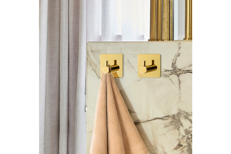 Enojno obešalo za kopalnico v sijajno zlati barvi združuje sodoben dizajn in preprosto funkcionalnost. Izdelano je iz barvanega jekla, njegov eleganten videz pa se lepo poda različnim notranjim slogom. Namestitev s samolepilnim trakom je hitra in enostavna, brez potrebe po vrtanju, zato predstavlja priročno in čisto rešitev.