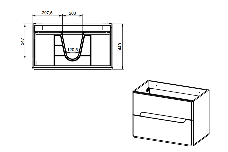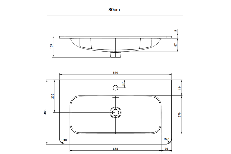 Dimenzije umivalnika: širina 800 mm, višina 155 mm, globina 465 mm