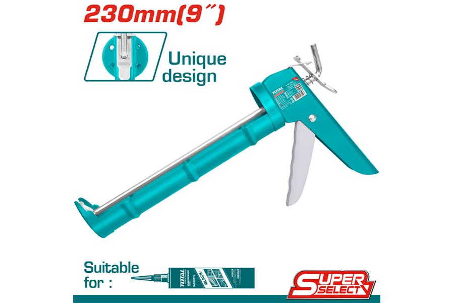 Mehanska pištola za tesnilne mase TOTAL THT21809 se uporablja pri montažnih in gradbenih delih. Z njeno pomočjo se tesnilna masa iztisne iz kartuše za zapolnjevanje različnih lukenj, šivov in votlin.