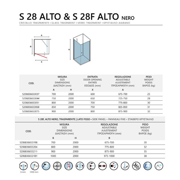 Pravokotna tuš kabina S28 Alto Free Nero Clear 85x80