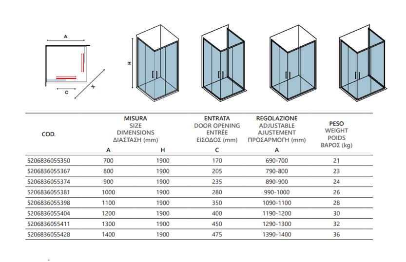 Tuš kabina ima prozorno kaljeno steklo debeline 5 mm, magnetno zapiranje, zlati mat profil.