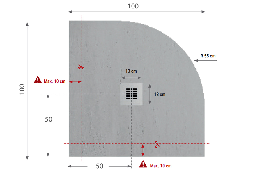 Pomembno: tuš kad iz umetnega kamna se lahko reže - s tem pa boste dobili svojo želeno dimenzijo nekoliko cm manjšo od navedene dimenzije. Navodila za rezanje kadi so prikazana na tehnični risbi. Na primer, tuš kad 100x100 lahko odrežete, da dobite dimenzijo 98x98 ali vsako drugo dimenzijo, ki jo potrebujete.