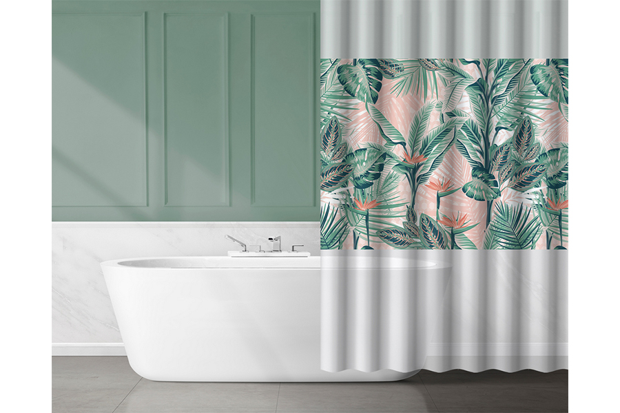 Zavesa za tuš je izdelana iz vodoodpornega materiala PEVA. Gre za mehko, prožno in okolju prijaznejšo plastiko, ki ne vsebuje PVC-ja in zato tudi ne vsebuje klora. Dekorativni trak s cvetličnim vzorcem na roza ozadju krasi sredino in ji dodaja subtilen, dekorativen pridih. Teža zavese je 90 g/m², debelina pa 0,1 mm, kar zagotavlja dobro vzdržljivost in optimalno trdnost. Komplet vsebuje 12 belih plastičnih obročev za obešanje na drog za tuš. Folija zavese je primerna za nežno ročno čiščenje pri 30 °C. Ne likajte, ne kemično čistite, ne belite in ne sušite v sušilnem stroju.