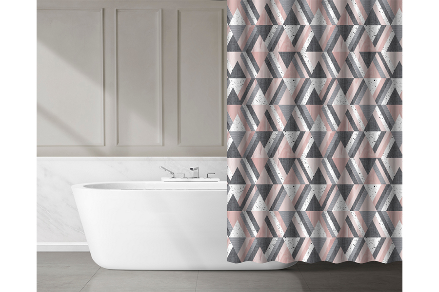 Tuš zavesa ima živahen geometrijski vzorec v treh barvah: beli, roza in sivi. Komplet vsebuje 12 belih obešalnih obročev. Tekstilna zavesa za tuš je primerna za nežno pranje v pralnem stroju pri 30 °C ter likanje pri nizkih temperaturah. Ne uporabljajte je za kemično čiščenje, beljenje ali sušenje v sušilnem stroju.